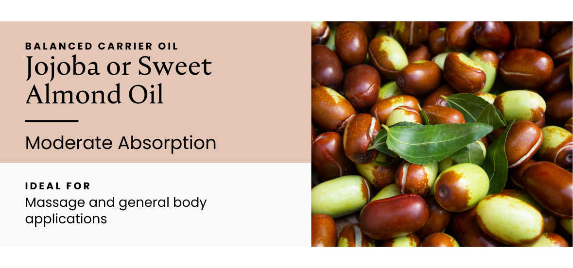 Lighter carriers such as Apricot Kernel Oil absorb relatively quickly and feel less occlusive. Balanced carriers such as Jojoba or Sweet Almond Oil provide moderate absorption and excellent glide, making them ideal for massage and general body applications.