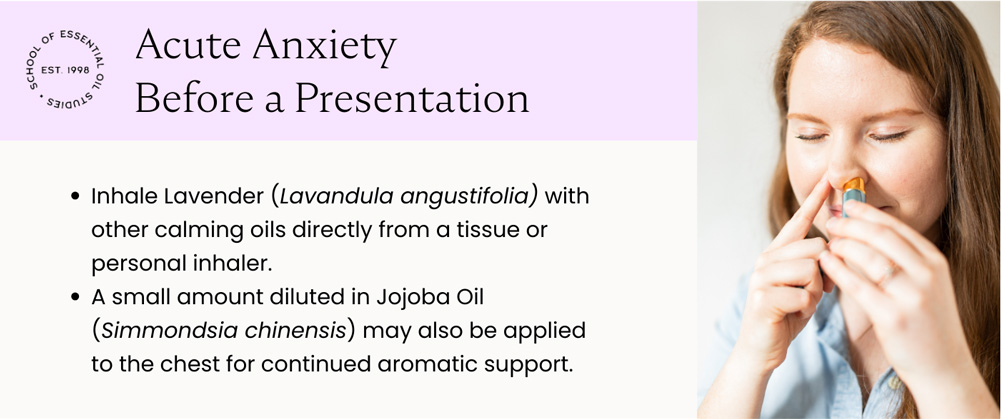 Inhale Lavender (Lavandula angustifolia) with other calming oils directly from a tissue or personal inhaler. A small amount diluted in Jojoba Oil (Simmondsia chinensis) may also be applied to the chest for continued aromatic support.