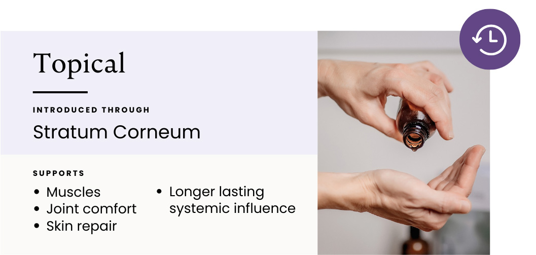 Topical application is especially useful when muscular support, joint comfort, skin repair, or extended localized contact is the therapeutic priority.