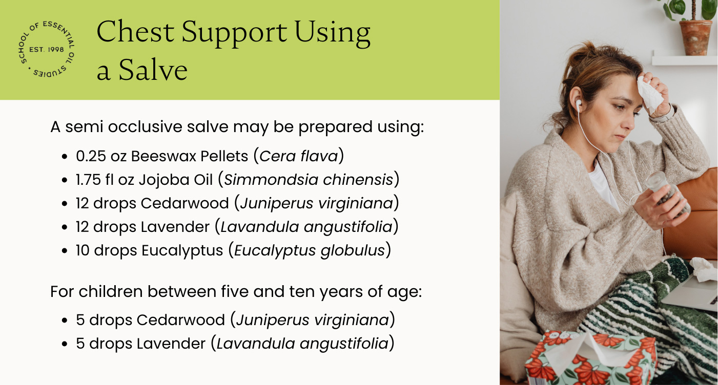 A salve creates a semi occlusive barrier that slows evaporation and prolongs localized exposure. When applied to the chest, volatile constituents are gradually released and gently inhaled over time while also remaining in contact with the skin. This dual pathway supports respiratory comfort through both aromatic influence and sustained tissue contact.