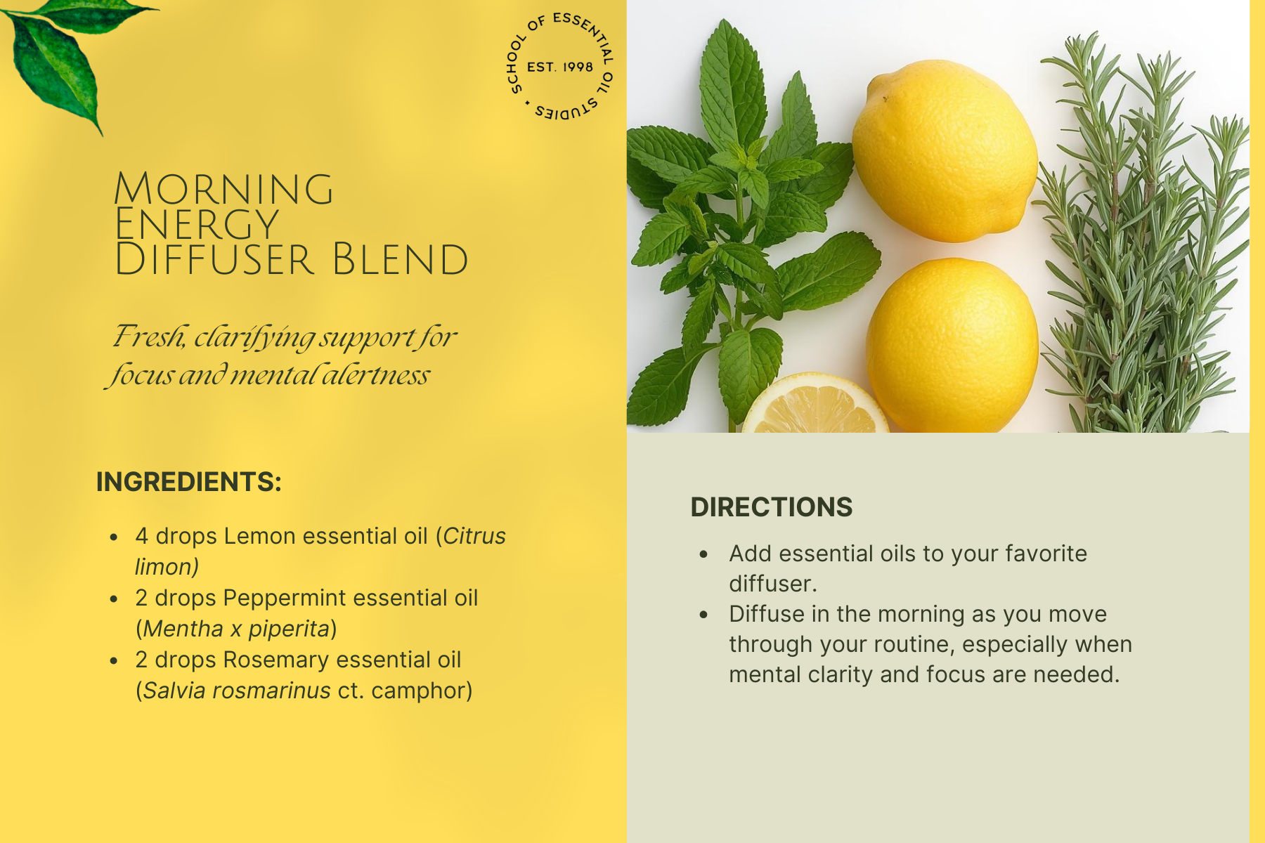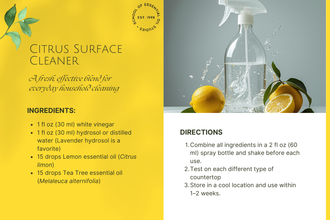 Lemon essential oil brings a bright, uplifting presence into everyday life. The following six recipes highlight its versatility, from mental clarity and circulation to skincare and home care.