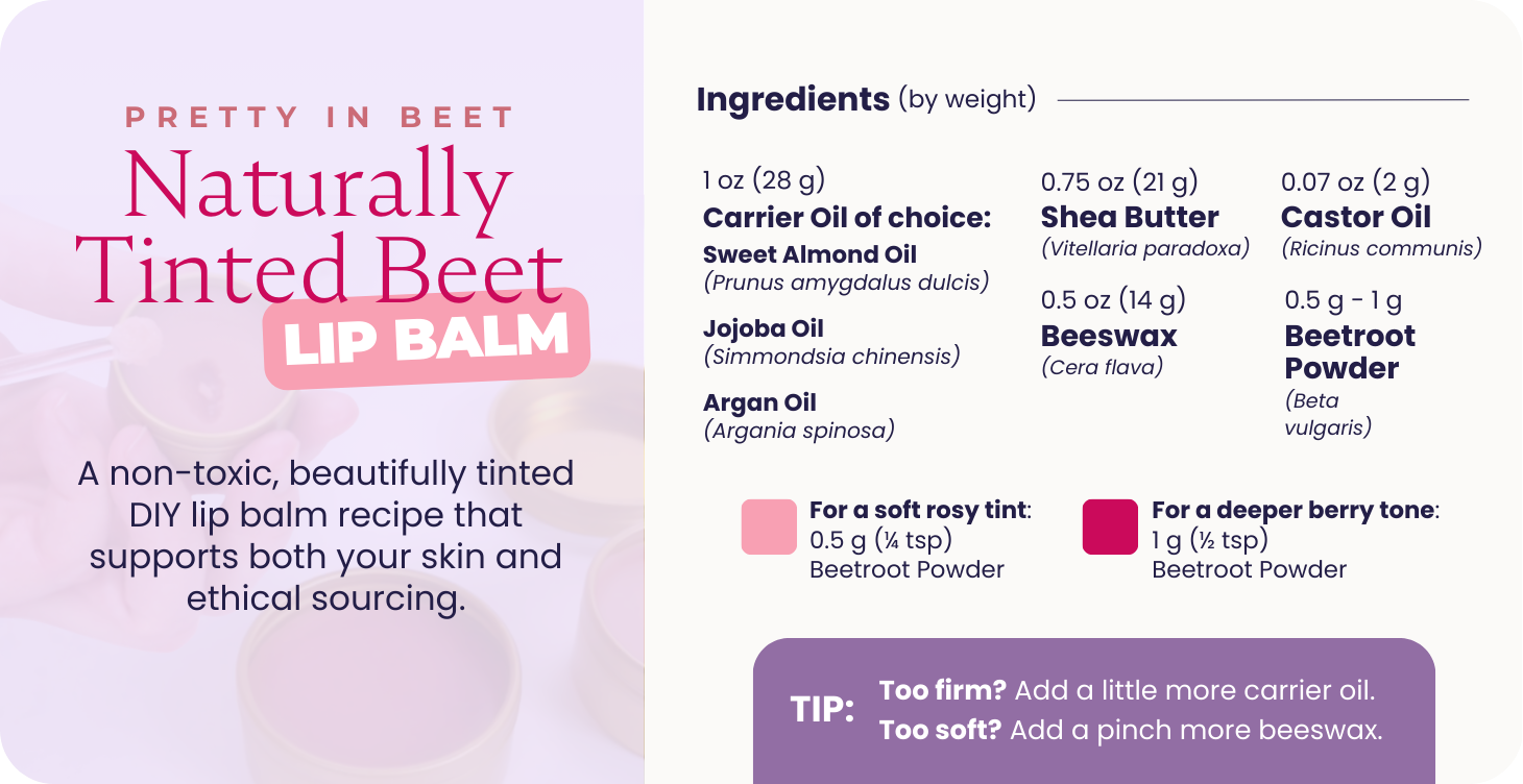 This DIY beetroot lip balm blends organic shea butter, beeswax, and botanical oils into a nourishing balm with a sheer tint from beetroot powder. It’s a moment of care for your skin, the producers behind each ingredient, and the ritual of making something by hand.